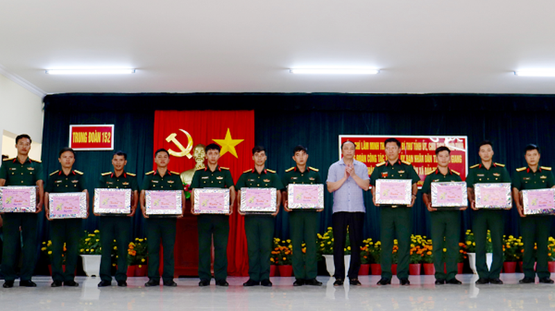 Chủ tịch UBND tỉnh Lâm Minh Thành (thứ tư, từ phải qua) tặng quà cho các chiến sĩ Trung đoàn 152.