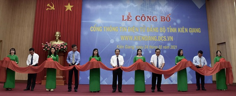 Các đại biểu thực hiện nghi thức cắt băng khai trương Cổng thông tin điện tử Đảng bộ tỉnh Kiên Giang, ngày 24-2.