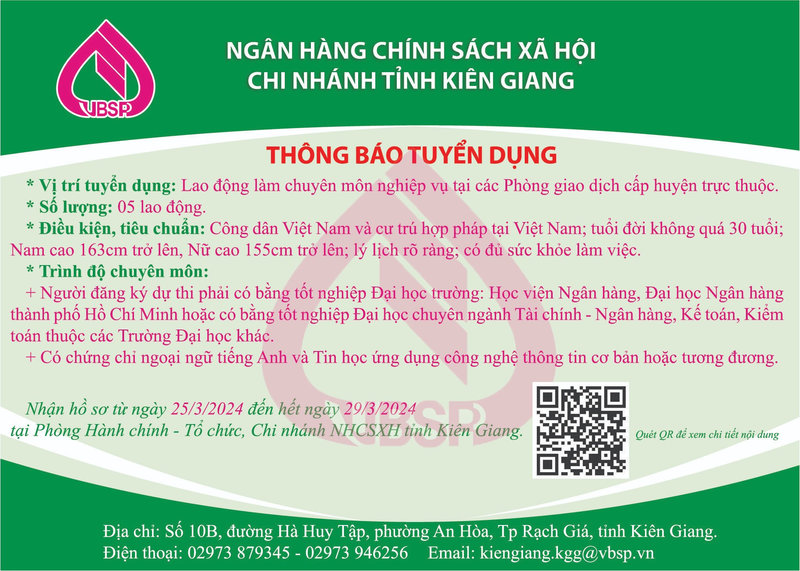 aA Thông báo Ngân hàng Chính sách xã hội chi nhánh Kiên Giang thông báo tuyển dụng. 15/03/2024, 13:39 Quay về Chia sẻ Copy link thành công Tin khác Chương trình cho vay học ngành Stem dành cho học sinh, sinh viên, học viên thạc sĩ, nghiên cứu sinh. Thông báo 03/09/2025 Bản tin đột xuất nhận định mưa lũ trên lưu vực sông Mê Công và vùng ĐBSCL do ảnh hưởng của cơn bão số 5 - (25/08/2025) Thông báo 26/08/2025 Tin bão Khẩn cấp(Cơn bão số 5) Thông báo 26/08/2025 Tin cuối cùng về cơn bão số 5 Thông báo 26/08/2025 Về việc treo Quốc kỳ và nghỉ Lễ Giỗ Tổ Hùng Vương, Lễ kỷ niệm 50 năm ngày Giải phóng hoàn toàn miền Nam, thống nhất đất nước (30/4/1975 - 30/4/2025) Thông báo 30/03/2025 Thông báo Chương trình cho vay nhà ở xã hội ngân hàng chính sách xã hội chi nhánh Kiên Giang Thông báo 27/03/2025 Về việc Kết luận thanh tra việc thực hiện các quy định pháp luật về quản lý, sử dụng tài chính ngân sách và quản lý xây dựng cơ bản tại UBND xã Cửa Cạn Thông báo 27/02/2025 Về việc treo Quốc kỳ và nghỉ tết Nguyên đán Ất Tỵ năm 2025 Thông báo 31/12/2024 Về việc treo Quốc kỳ và nghỉ tết Dương lịch năm 2025 Thông báo 10/12/2024 Về việc triệu tập thí sinh tham dự xét tuyển vòng 2 kỳ tuyển dụng viên chức năm 2024 Thông báo 19/11/2024 /ngan-hang-chinh-sach-xa-hoi-chi-nhanh-kien-giang-thong-bao-tuyen-dung