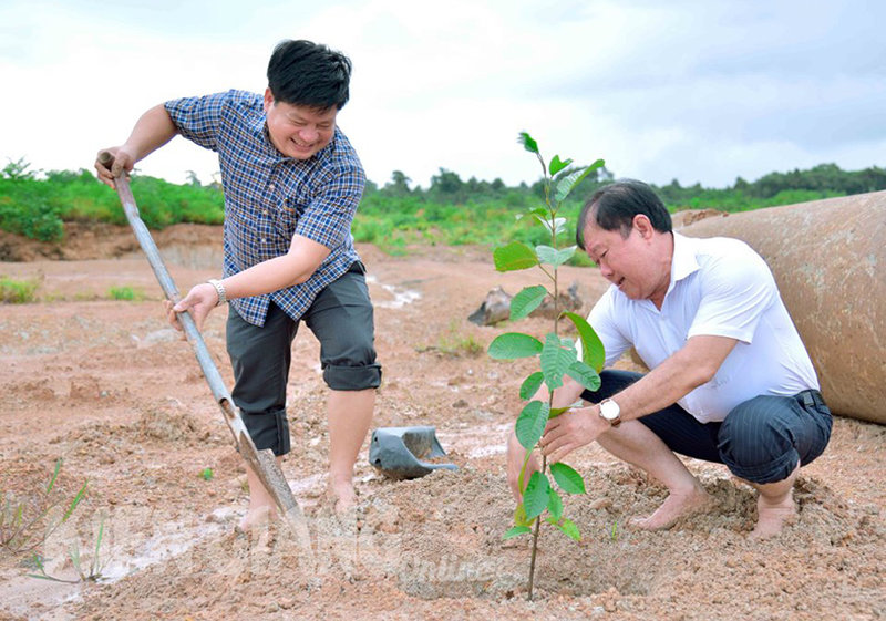 Đồng chí Tống Phước Trường (bên trái) - Ủy viên Ban Thường vụ Tỉnh ủy Kiên Giang, Bí thư Thành ủy Phú Quốc và đồng chí Nguyễn Văn Tiệp - Giám đốc Vườn quốc gia Phú Quốc trồng cây, sáng 8-7-2022