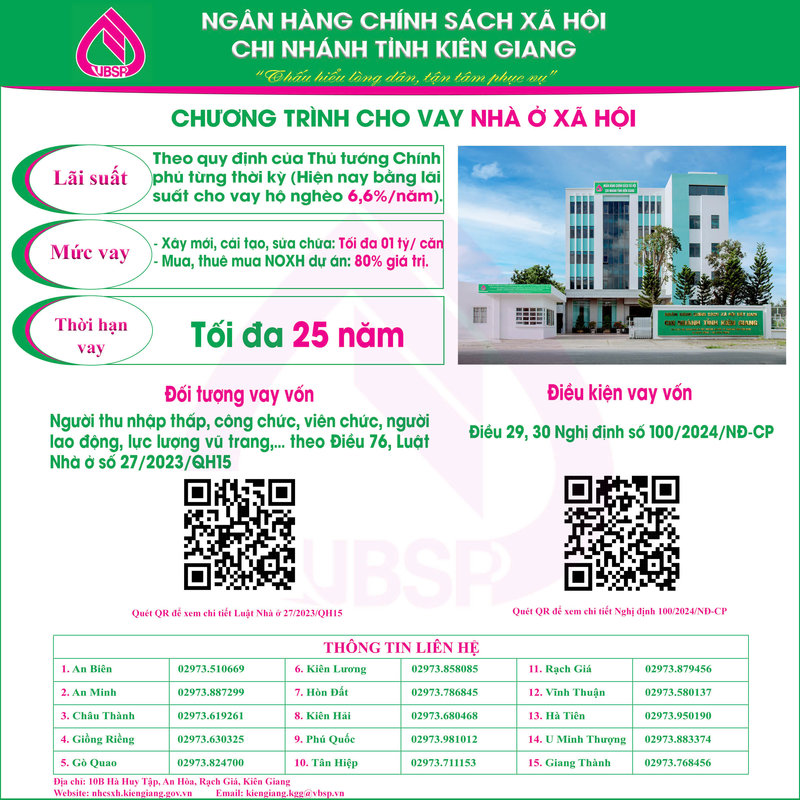 aA Thông báo Thông báo Chương trình cho vay nhà ở xã hội ngân hàng chính sách xã hội chi nhánh Kiên Giang 27/03/2025, 15:58 Thông báo Chương trình cho vay nhà ở xã hội ngân hàng chính sách xã hội chi nhánh Kiên Giang Quay về Chia sẻ Copy link thành công Tin khác Chương trình cho vay học ngành Stem dành cho học sinh, sinh viên, học viên thạc sĩ, nghiên cứu sinh. Thông báo 03/09/2025 Bản tin đột xuất nhận định mưa lũ trên lưu vực sông Mê Công và vùng ĐBSCL do ảnh hưởng của cơn bão số 5 - (25/08/2025) Thông báo 26/08/2025 Tin bão Khẩn cấp(Cơn bão số 5) Thông báo 26/08/2025 Tin cuối cùng về cơn bão số 5 Thông báo 26/08/2025 Về việc treo Quốc kỳ và nghỉ Lễ Giỗ Tổ Hùng Vương, Lễ kỷ niệm 50 năm ngày Giải phóng hoàn toàn miền Nam, thống nhất đất nước (30/4/1975 - 30/4/2025) Thông báo 30/03/2025 Về việc Kết luận thanh tra việc thực hiện các quy định pháp luật về quản lý, sử dụng tài chính ngân sách và quản lý xây dựng cơ bản tại UBND xã Cửa Cạn Thông báo 27/02/2025 Về việc treo Quốc kỳ và nghỉ tết Nguyên đán Ất Tỵ năm 2025 Thông báo 31/12/2024 Về việc treo Quốc kỳ và nghỉ tết Dương lịch năm 2025 Thông báo 10/12/2024 Về việc triệu tập thí sinh tham dự xét tuyển vòng 2 kỳ tuyển dụng viên chức năm 2024 Thông báo 19/11/2024 Thông báo về việc đăng công khai tài sản bán đấu giá Thông báo 11/11/2024 /thong-bao-chuong-trinh-cho-vay-nha-o-xa-hoi-ngan-hang-chinh-sach-xa-hoi-chi-nhanh-kien-giang