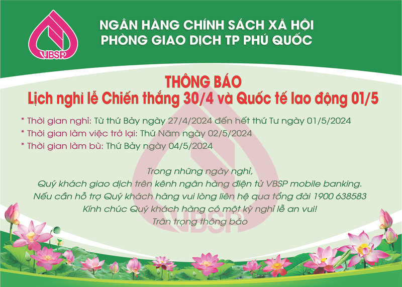 aA Thông báo Thông báo lịch nghỉ Lễ 30/4 và 01/5 ngân hàng CSXH thành phố 25/04/2024, 12:46 Quay về Chia sẻ Copy link thành công Tin khác Chương trình cho vay học ngành Stem dành cho học sinh, sinh viên, học viên thạc sĩ, nghiên cứu sinh. Thông báo 03/09/2025 Bản tin đột xuất nhận định mưa lũ trên lưu vực sông Mê Công và vùng ĐBSCL do ảnh hưởng của cơn bão số 5 - (25/08/2025) Thông báo 26/08/2025 Tin bão Khẩn cấp(Cơn bão số 5) Thông báo 26/08/2025 Tin cuối cùng về cơn bão số 5 Thông báo 26/08/2025 Về việc treo Quốc kỳ và nghỉ Lễ Giỗ Tổ Hùng Vương, Lễ kỷ niệm 50 năm ngày Giải phóng hoàn toàn miền Nam, thống nhất đất nước (30/4/1975 - 30/4/2025) Thông báo 30/03/2025 Thông báo Chương trình cho vay nhà ở xã hội ngân hàng chính sách xã hội chi nhánh Kiên Giang Thông báo 27/03/2025 Về việc Kết luận thanh tra việc thực hiện các quy định pháp luật về quản lý, sử dụng tài chính ngân sách và quản lý xây dựng cơ bản tại UBND xã Cửa Cạn Thông báo 27/02/2025 Về việc treo Quốc kỳ và nghỉ tết Nguyên đán Ất Tỵ năm 2025 Thông báo 31/12/2024 Về việc treo Quốc kỳ và nghỉ tết Dương lịch năm 2025 Thông báo 10/12/2024 Về việc triệu tập thí sinh tham dự xét tuyển vòng 2 kỳ tuyển dụng viên chức năm 2024 Thông báo 19/11/2024 /thong-bao-lich-nghi-le-304-va-015-ngan-hang-csxh-thanh-pho