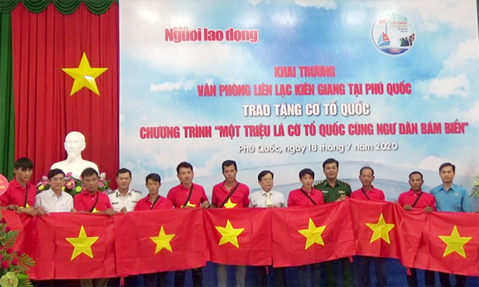 Chiều 18-7, tại huyện đảo Phú Quốc, Báo Người Lao Động phối hợp cùng Tổng Công ty Điện lực Miền Nam, LĐLĐ huyện Phú Quốc, Bộ Tư lệnh vùng cảnh sát biển 4 và Ban Chỉ huy Biên phòng cửa khẩu cảng Dương Đông tổ chức lễ trao 1.000 lá cờ Tổ quốc và quà cho ngư dân huyện đảo này.